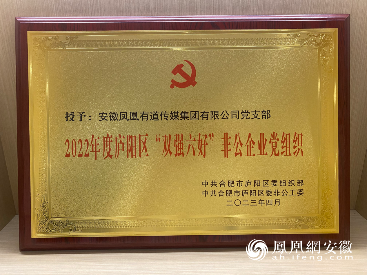 近日,安徽凤凰有道传媒集团有限公司党支部被中共合肥市庐阳区组织部、中共合肥市庐阳区委非公工委授予2022年度庐阳区“双强六好”非公企业党组织荣誉称号,以表彰安徽凤凰有道集团作为先进典型,在非公党建工作中发挥的示范引领作用。