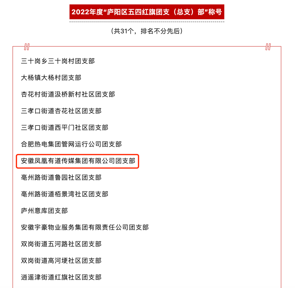 传承五四薪火,展现青春风采。为表彰先进,激励广大团员、团干部和各级团组织奋发有为,发挥先锋模范作用。近日,共青团庐阳区委员会作出表彰决定,安徽凤凰有道传媒集团团支部被授予2022年度庐阳区“五四红旗团支(总支)部”称号。