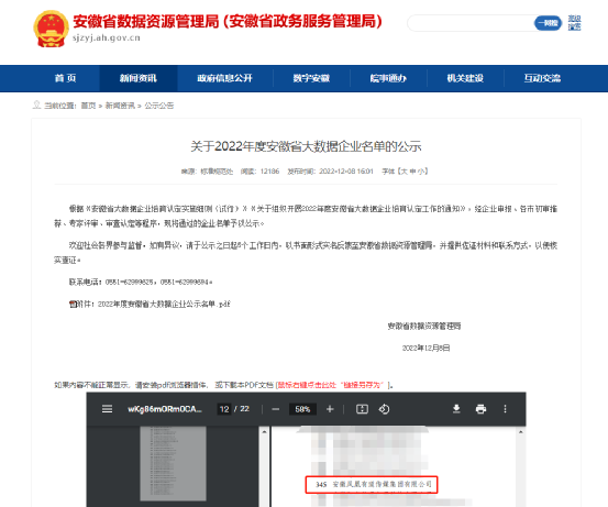 近日,安徽省数据资源管理局发布《关于2022年度安徽省大数据企业名单的公示》。安徽凤凰有道集团顺利通过层层评选,荣获2022年安徽省大数据企业。