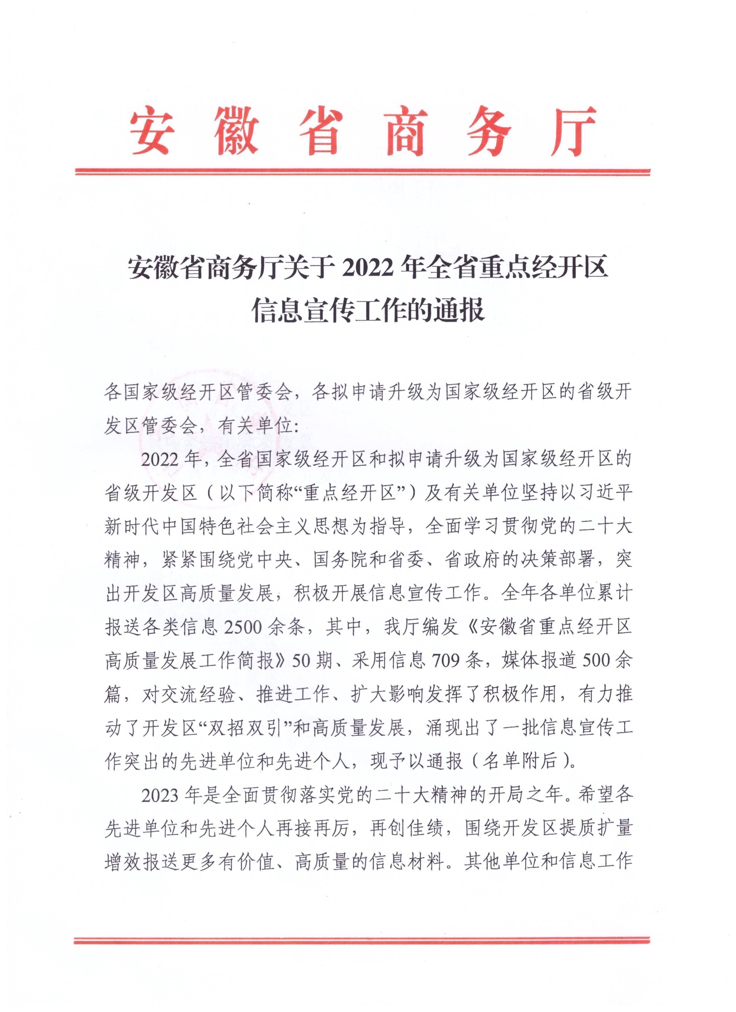 安徽省商务厅近期发布关于 2022 年全省重点经开区信息宣传工作的表彰通报,其中名单显示,安徽凤凰有道集团被评为2022 年全省重点经开区信息宣传工作先进单位。